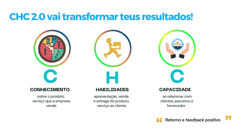 Você, irá aprender que as pessoas são a alma do negócio. Quando contratadas, elas trazem consigo apenas o famoso Conhecimento, Habilidade e Atitude (CHA), mas só isso, gera caixa e não o lucro desejado. Precisam evoluir para o CHC 2.0 que se traduz em (CONHECIMENTO sobre o produto e serviço que a empresa vende), (HABILIDADE de manuseio e entrega do produto e serviço ao cliente), (CAPACIDADE de se relacionar com clientes parceiros e fornecedores), para dobrar o lucro, de forma automática, atingir as metas e objectivos, sem a presença constante dos donos do negócio.